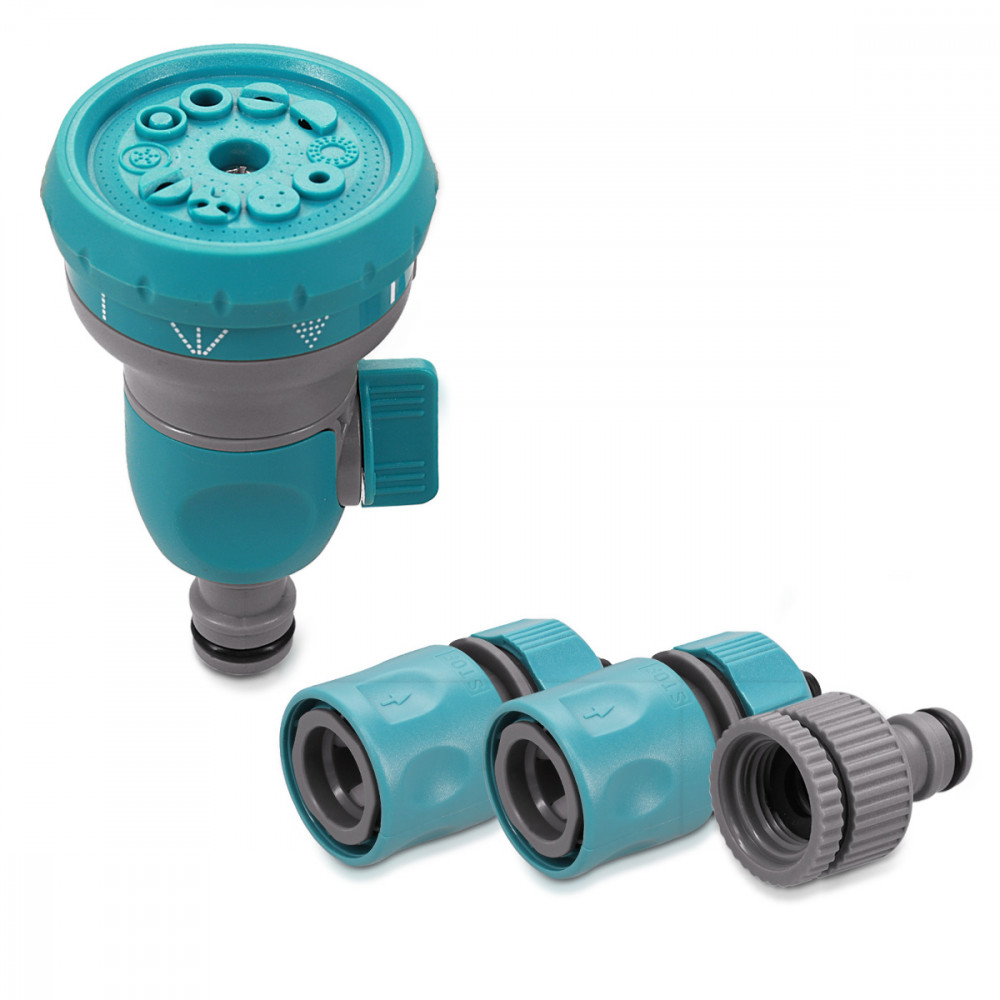 Ten 4-częściowy zestaw zawiera wszystko, czego potrzebujesz, aby zacząć Dzięki dyszy i 3 złączom wystarczy wąż ogrodowy i kran, do którego można go podłączyć.