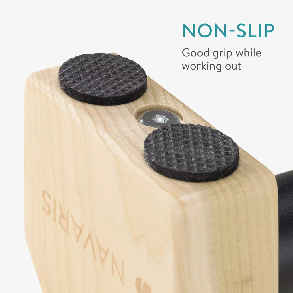 Drewniane poręcze Navaris są idealne do treningów CrossFit oraz ćwiczeń takich jak pompki, dipsy czy podciąganie. Wykonane z drewna sosnowego i wysokiej jakości materiałów antypoślizgowych zapewniają stabilność i pewny chwyt, wytrzymując do 200 kg.