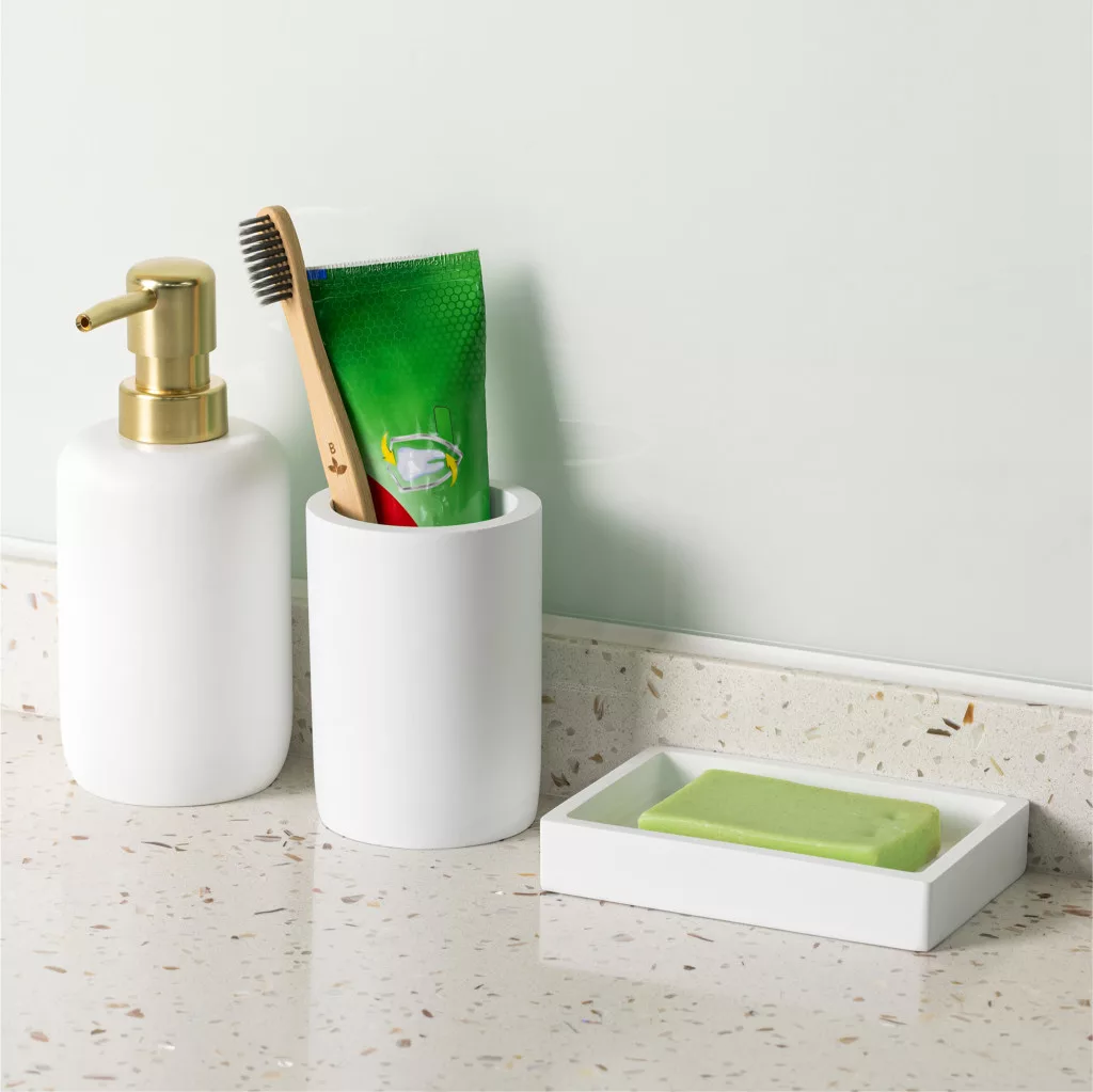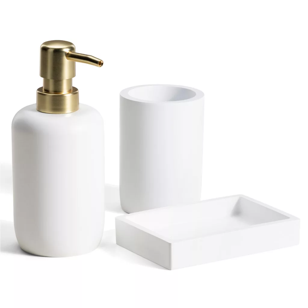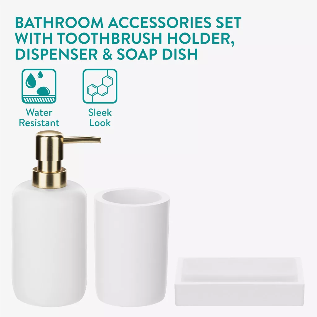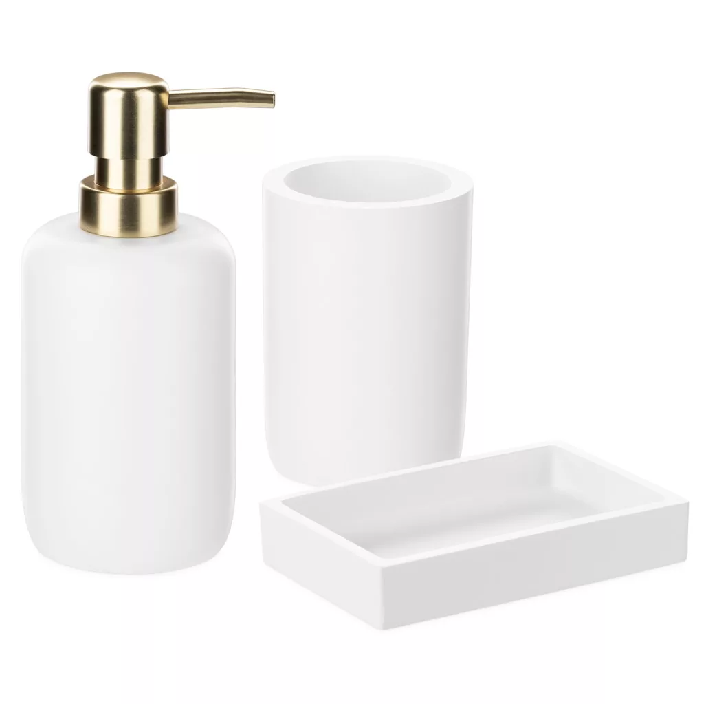 Set accesorii baie Navaris, 3 piese, suport periute, dozator si savoniera, polirasina, alb, rasina