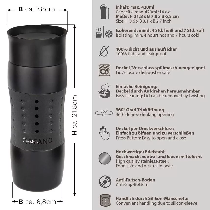 Cana termos Creano Design Travel Mug, 420 ml, inox, etansa, deschidere 360, negru
