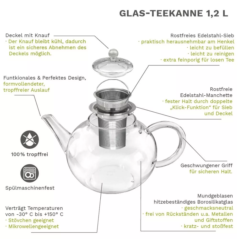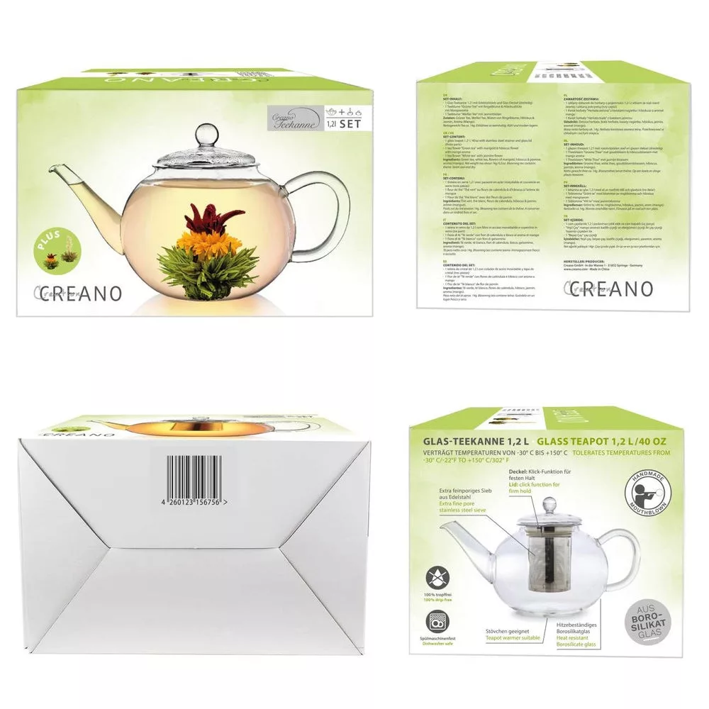 Ceainic din sticla Creano, 1,2 L, cu infuzor din inox, capac si 2 flori de ceai