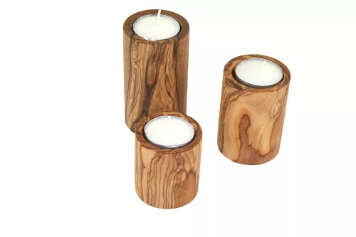Zestaw 3 świeczników na tealighty z drewna oliwnego tworzy ciepłą atmosferę w każdym wnętrzu. Każdy element ma unikalne usłojenie, a trzy różne wysokości dają harmonijny efekt dekoracyjny na stole, komodzie lub półce.